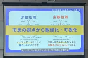 三島市は「幸福度=Well-being」を政策の中心に据え、独自の地域幸福度指標を策定。調査は市民3万人の公式LINE登録者に配信し、健康・地域のつながり・文化活動などを数値化。施策ごとに「関連するWell-being指標」を明記し、政策の目的を“幸福の実現”という共通言語で統一している。国のデジタル田園都市交付金を活用し、データに基づく政策形成(EBPM)を推進している。